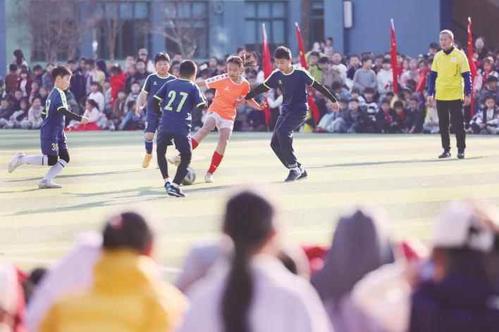 昨天下午,嘉兴市秀城实验教育集团2026年“校长杯”校园足球联赛在吉水校区正式拉开帷幕。开幕式后,吉水校区主场迎战钧儒校区。队员们在绿茵场上奋力奔跑、积极拼抢、默契传球,展现出昂扬向上的精神风貌。